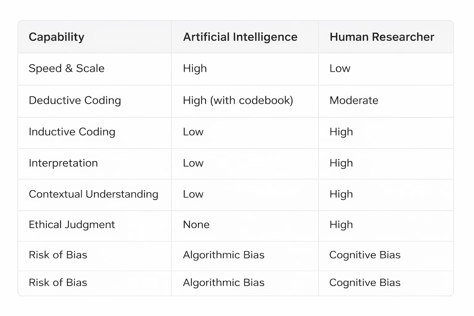 However, the limitations of AI are as significant as its capabilities. Current AI models lack true understanding and are unable to “read between the lines” of human communication—a hallmark of inductive analysis . They struggle with complex methodologies that require a deep, emergent understanding of the data, such as grounded theory. Furthermore, the risk of AI “hallucinations,” where the model generates plausible but false information, remains a serious concern that necessitates constant vigilance from the researcher .